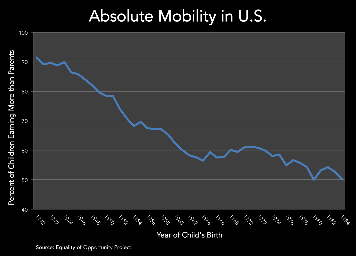 New research shows that a more foundational metric of mobility — absolute mobility, which measures how much money children make compared to their parents, adjusted for inflation — has collapsed in the US in recent decades.