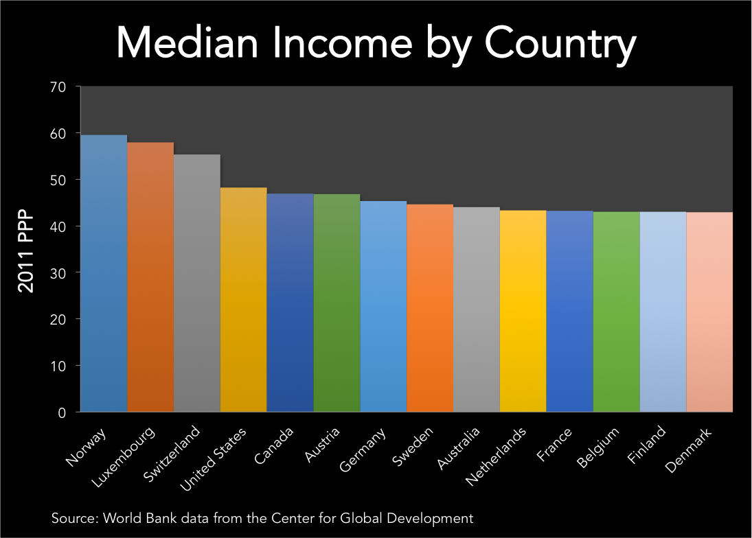 Particularly for those in the bottom half of the income distribution, and even for those in the middle, the US doesn’t offer the highest incomes. As poverty researcher Matt Bruenig has explained, the very poorest fare much, much better in other countries — particularly those (like Norway, Denmark, Finland, and Canada, among others) that have more social-democratic political systems and, therefore, stronger unions and more generous welfare states. By a variety of measures, countries like Canada and Norway have also surpassed the US when it comes to median incomes, and a host of other countries are not far behind.
